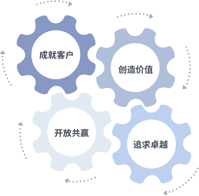 成就客户是一切决策的出发点,,,创造价值是衡量所有工作的标准,,,,追求卓越是我们做事做人的态度,,,开放共赢是我们的格局也是最终的结果。。。。价值观的齿轮环环相扣,,,,推动着组织里的每个人不断向前。。。